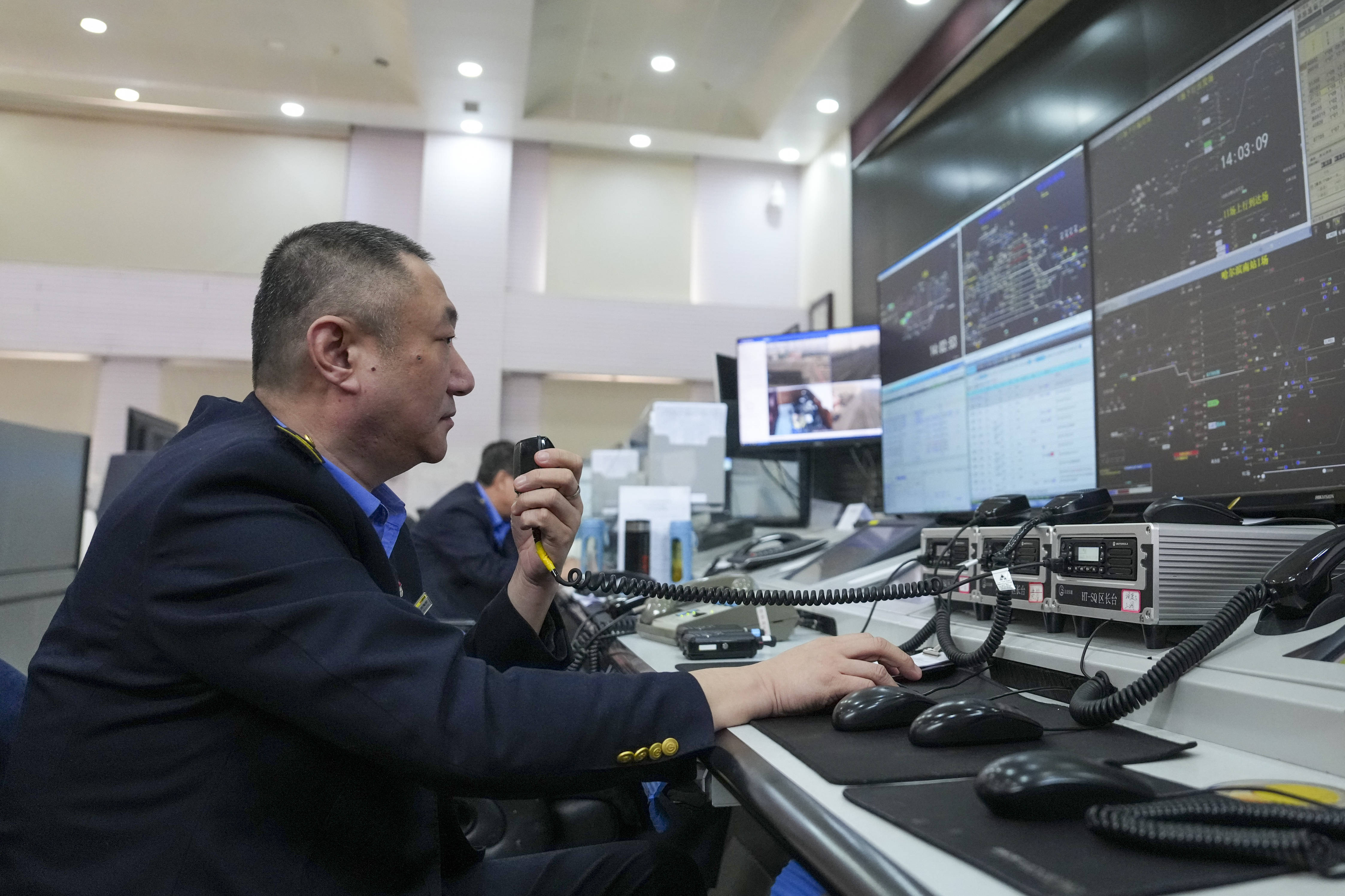 在哈尔滨南(nan)站(zhan)调度车间,工作人员对货运列车发出(chu)调度指令(3月17日(ri)摄)。