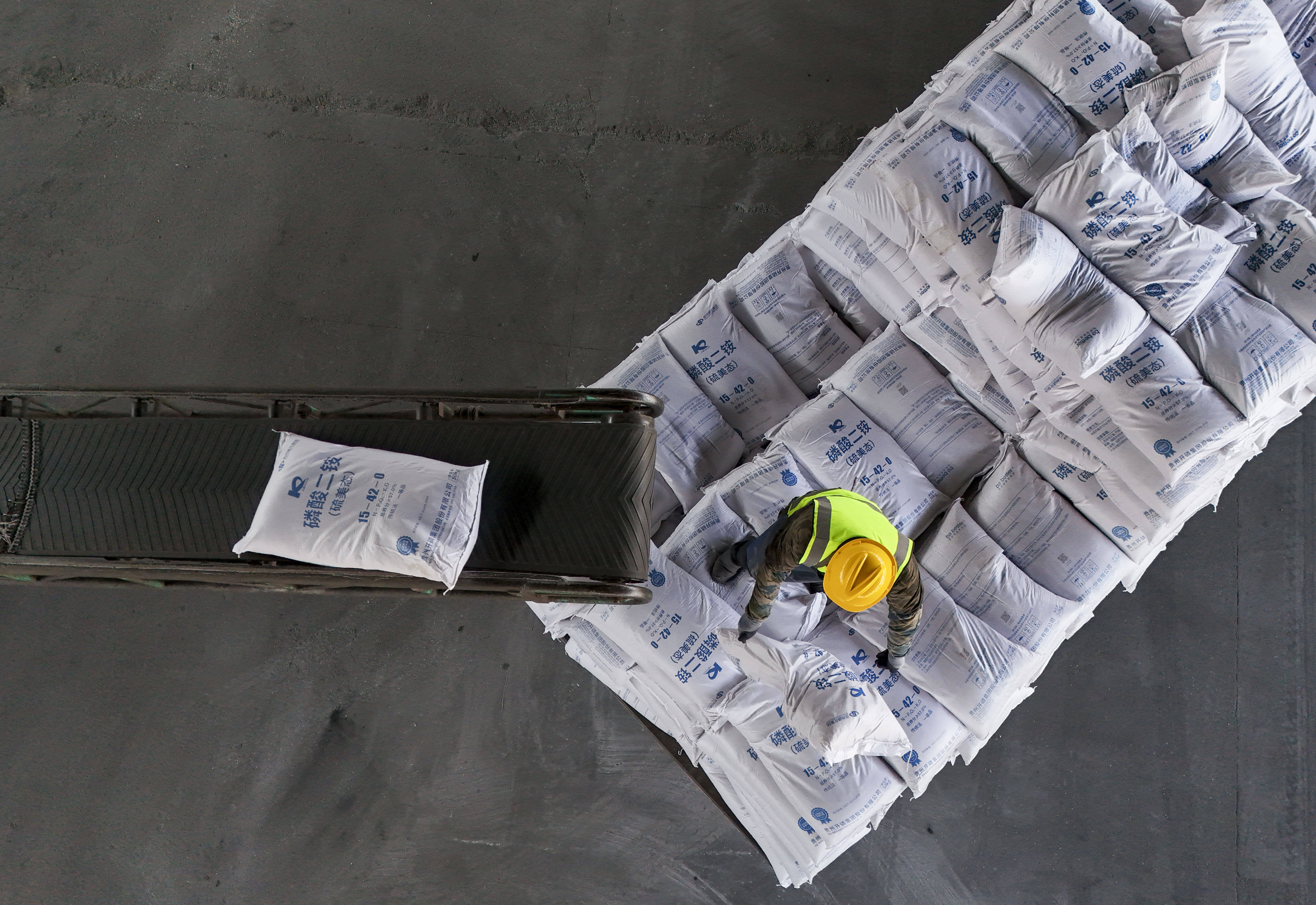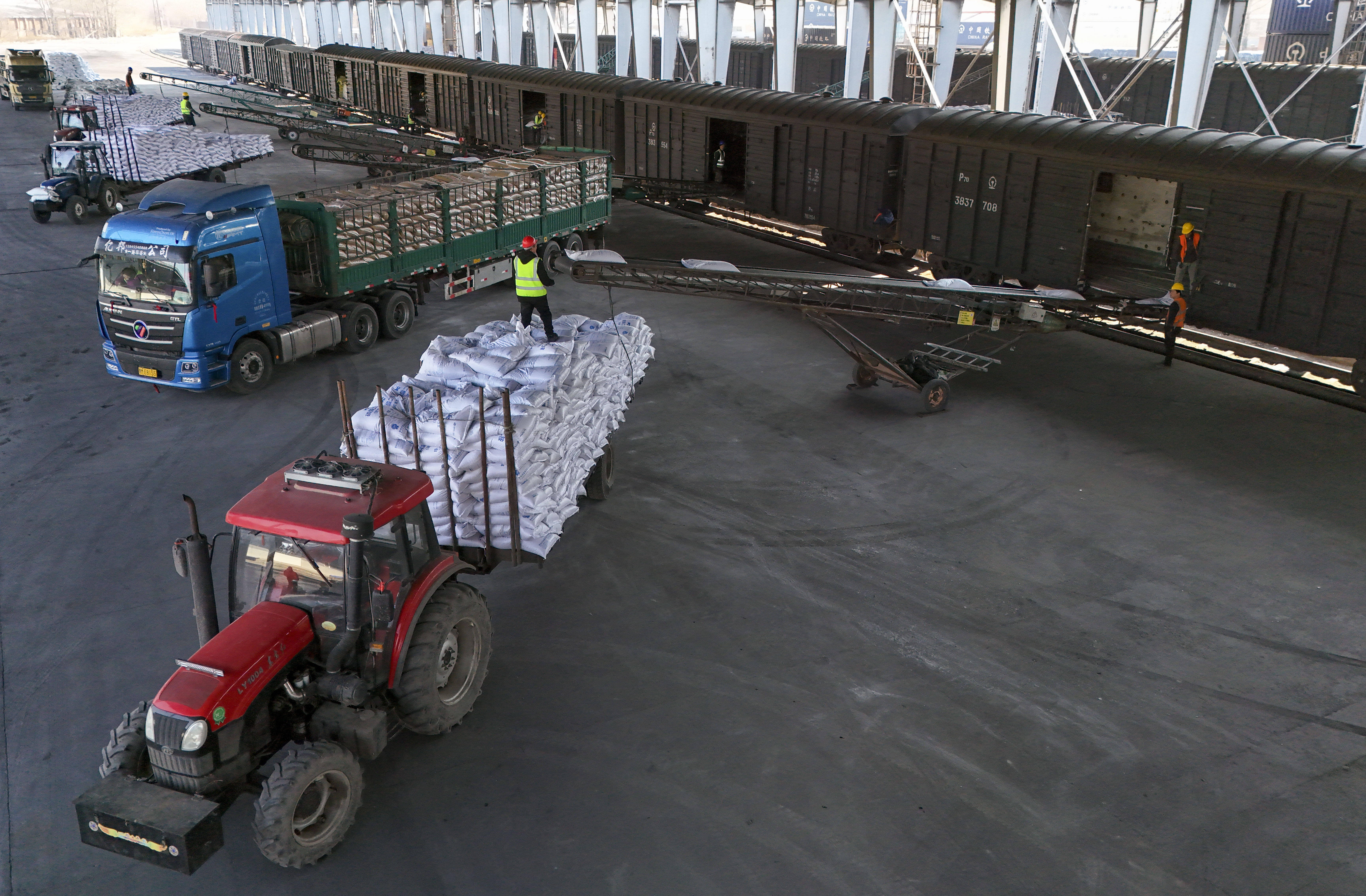 3月17日(ri),工人在位于绥化市的哈尔滨铁路物(wu)流中心绥化业务部农资(zi)装卸功课现场卸化肥(无人机照片)。