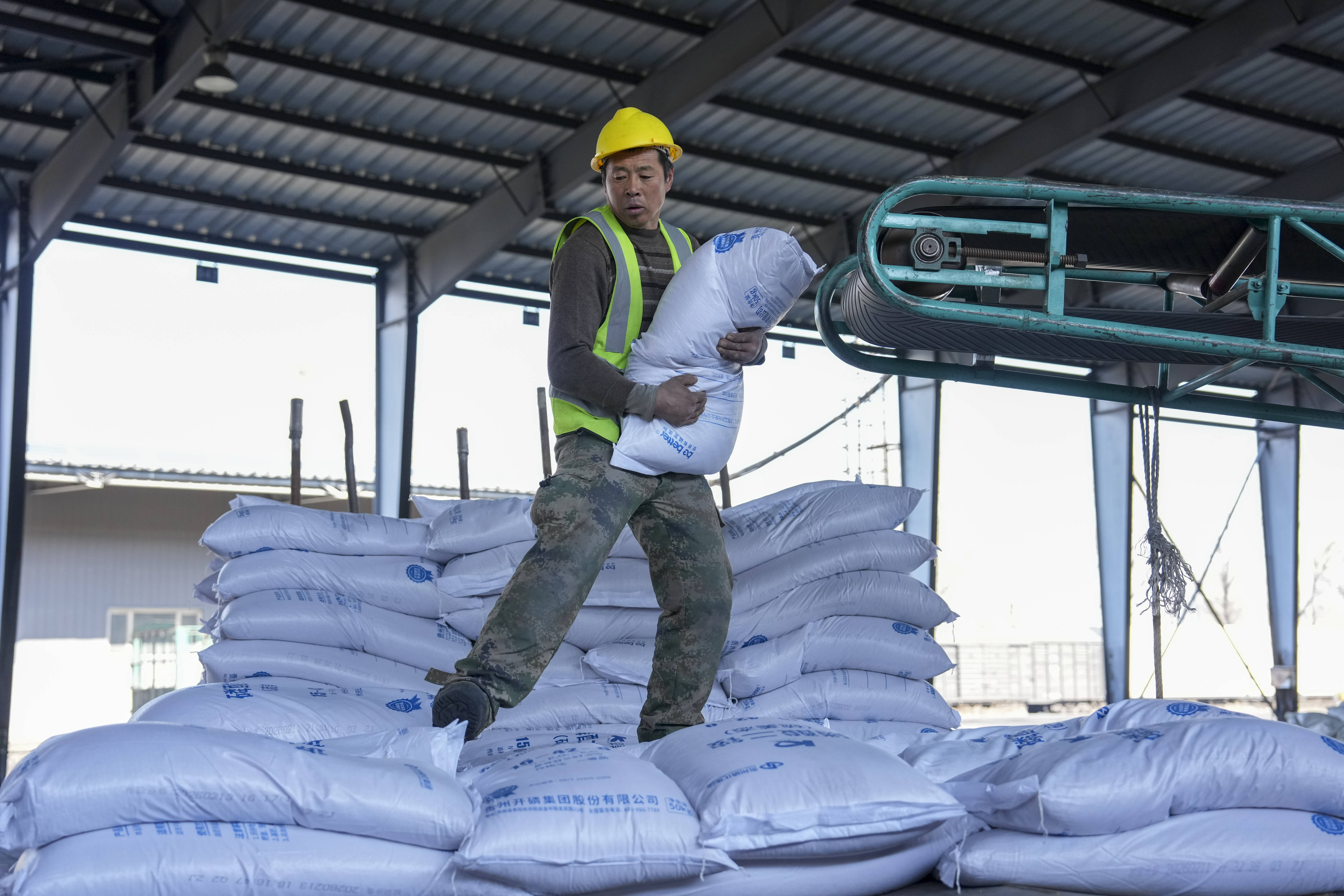 3月17日(ri),工人在位于绥化市的哈尔滨铁路物(wu)流中心绥化业务部农资(zi)装卸功课现场卸化肥。