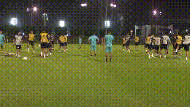 伊朗国度足球队前锋(feng)迈赫迪·塔雷米(9号球衣)与队友(you)举行传接球训练。
