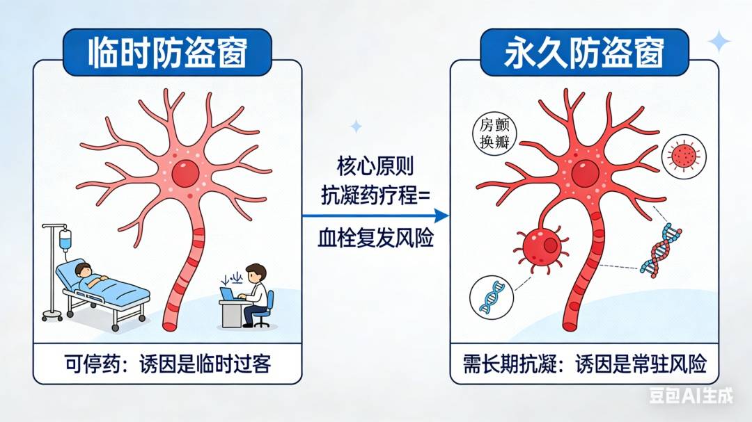 停不停药,不看时间长短,只看一个关(guan)键:血栓(shuan)风险(xian)这个“钉(ding)子户”,到底搬走了没有(you)。