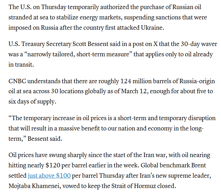 美国财政部长贝森特在社媒平台上发帖(tie)称,这项为期 30 天的豁免是(shi)一项“针对(dui)性强的短期措施”,仅适用于已(yi)在运输途中的俄油。图为美国消费者旧事(shi)与商业频道网站报(bao)道截图。