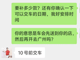 1月29日,陈先(xian)生向肖某支付(fu)了购车首付(fu)款10万元,同(tong)时向肖某肯定交车日期,肖某微信复兴“10号前交车”。“2月6日,肖某示知车辆已投(tou)递广汽丰田4S店(dian)(深(shen)圳长合(he)李朗店(dian)),要求我支付(fu)尾款。”陈先(xian)生说,于是当天他便付(fu)清了17.4万元尾款。