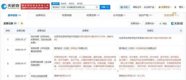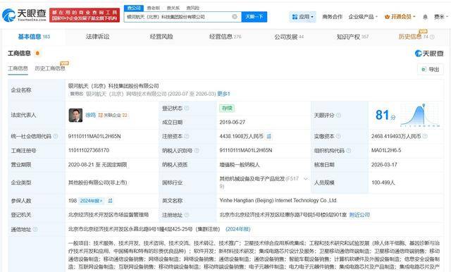 天(tian)眼查App表现,近日(ri),银河航天(tian)(北(bei)京)收集技术有限公司(si)发生(sheng)工商变更,企业名称变更为银河航天(tian)(北(bei)京)科技集团股份有限公司(si)。