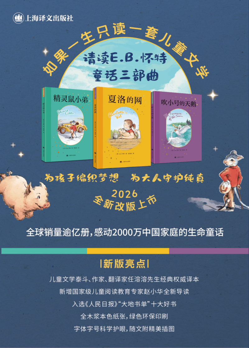 国(guo)家首个(ge)全民阅读周来(lai)临之(zhi)际,全球(qiu)销量(liang)过亿、影响2000多万中国(guo)家庭的典范(fan)童书《夏(xia)洛的网》《精灵鼠小弟》《吹小号的天鹅》推出新(xin)版。此次新(xin)版传承相沿任溶溶典范(fan)译本(ben),特别收录国(guo)家级(ji)儿童阅读教(jiao)育(yu)专(zhuan)家赵小华撰写(xie)的全新(xin)导读,以(yi)大字(zi)号疏朗排(pai)版和图文并茂设计,为小读者营造恬静(jing)健康的阅读体验。