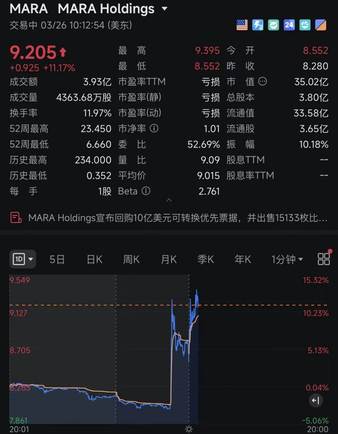 MARA Holdings涨超11%,公司宣告(gao)回购10亿美元可转换优先票据,并出卖15133枚比特(te)币(bi)。