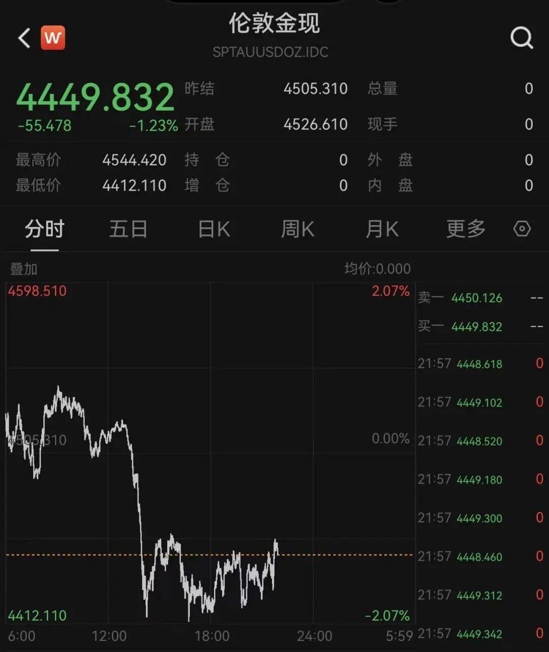 黄(huang)金白银双双下(xia)跌(die),现货黄(huang)金日内短线跳水,跌(die)超1.23%,回落(luo)至4449美元/盎司。现货白银跌(die)幅一度扩(kuo)展至6%,停止发稿,跌(die)幅缩(suo)小至2.99%,最新报69美元/盎司。