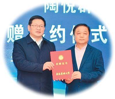 陶悦群(右)捐赠(zeng)设立安徽医(yi)科大学“陶悦群奖创基金”。