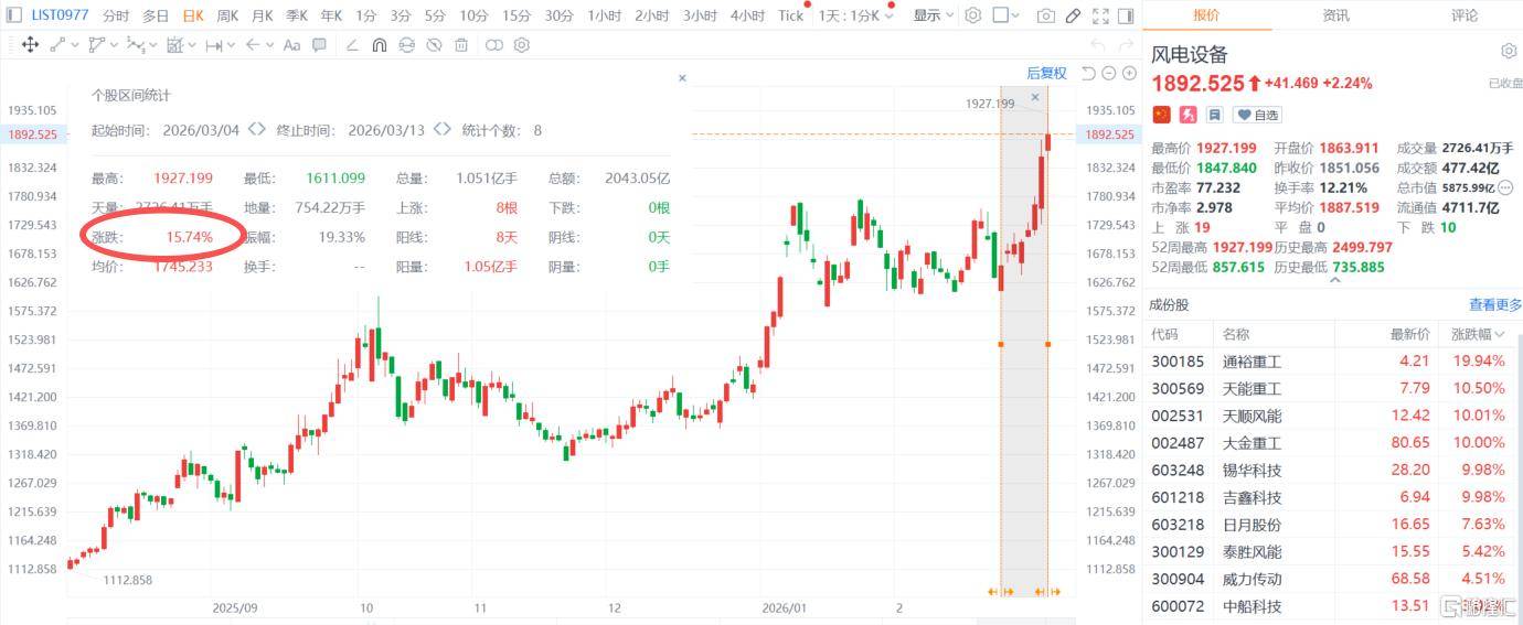 截至(zhi)发稿,A股风(feng)电板(ban)块已经连续已实现(xian)“八(ba)连阳”,累计涨幅(fu)超15%。