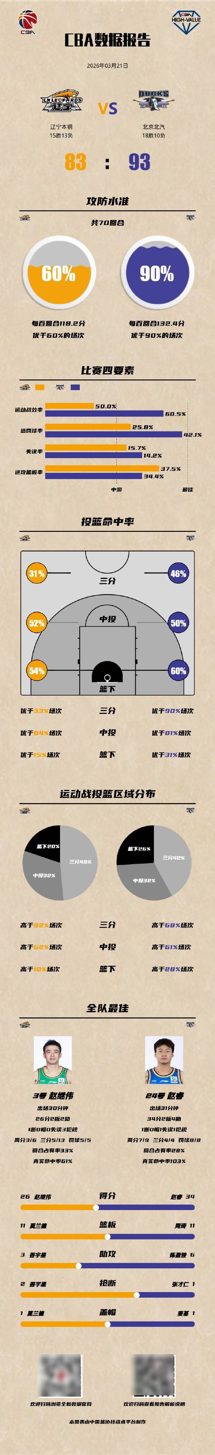 21日晚,北汽(qi)男(nan)篮在客场以93比83逆转取胜辽宁队。本场比赛,北汽(qi)男(nan)篮后(hou)卫外援杰曼由于家人生病提前返回北京,他错(cuo)过这场激(ji)烈对决。虽然(ran)杰曼的缺阵对球队产生了不利影响,但好在赵睿与陈盈骏在下半场都有着(zhe)出色的进攻发挥。赵睿在第三节的表(biao)现非常出色,他单节得到14分。正是在他的凶猛进攻火力带动下,北汽(qi)男(nan)篮在这一节实现了比分的反超。这也是比赛的重要转折点。同时,陈盈骏在末节也有令人印(yin)象深刻的进攻表(biao)现,他接连得到9分,这帮助球队稳定了场上的局面。