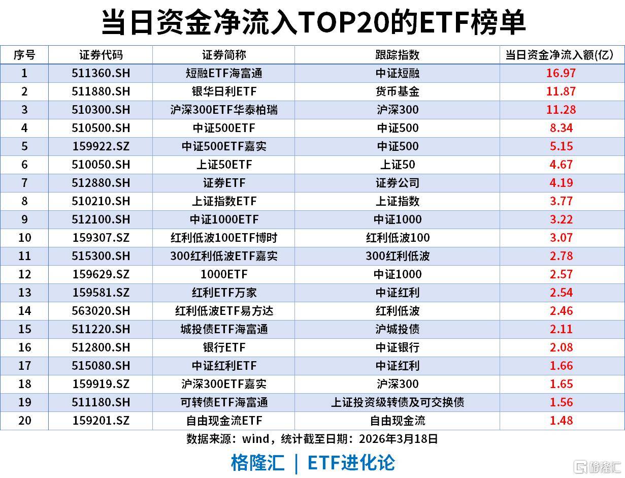 当(dang)日ETF资金净(jing)流(liu)入TOP20(截(jie)至2026-03-18)