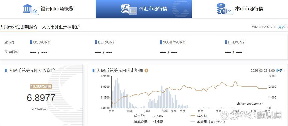 在岸人(ren)民币兑美圆(CNY)北(bei)京(jing)时间03:00收报6.8986元,较周二夜盘收盘跌70点。成(cheng)交量486.85亿美圆。