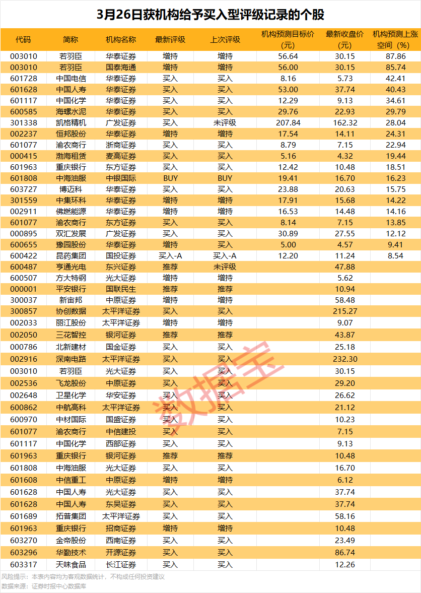 今日获机构给(gei)予买入(ru)型(xing)评级的个股中,共有(you)19条评级纪(ji)录中对相干个股给(gei)出了展望目标(biao)价。以公布的展望目标(biao)价与最新收盘价进行比拟表现,共有(you)8股上(shang)涨空间超20%。