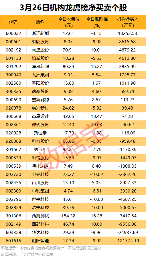 机构净卖出个股中,明(ming)阳(yang)智能遭机构净卖出12.18亿元,居首;紧随厥后(hou)是华达科技,净卖出金额为(wei)2.49亿元。