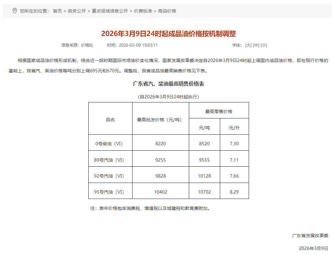 广东(dong)省发展和改革委员会3月9日曾发布油价调整消息称,国家(jia)发展改革委决定自2026年3月9日24时起上调国内成品(pin)油价格,即在现行(xing)价格的(de)基础上,广东(dong)省汽、柴油价格每吨分别上调695元和670元。