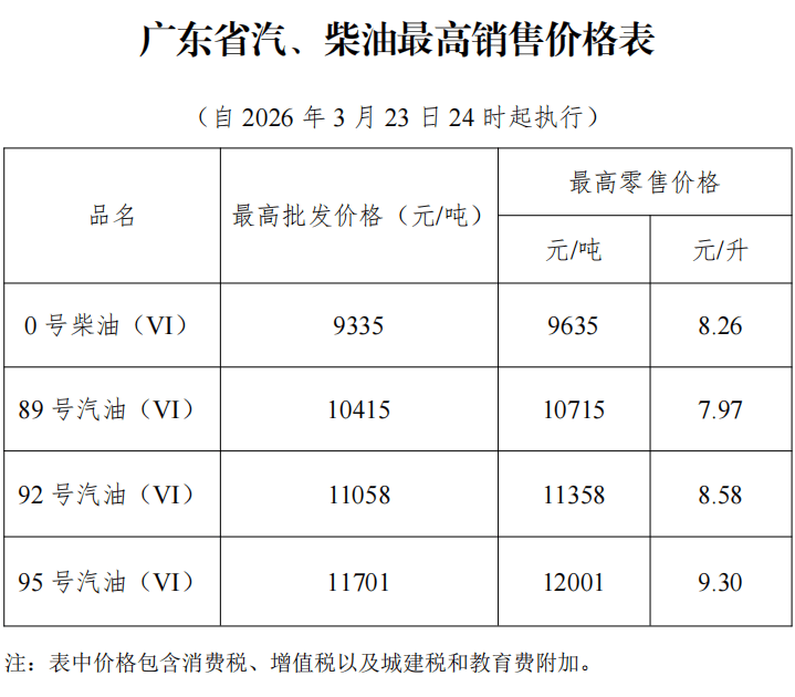 根据国家(jia)成品(pin)油价格形成机制,结(jie)合近一段时期国际市场油价变化情况,国家(jia)发展改革委在保持现行(xing)价格机制框架的(de)基础上,对国内成品(pin)油价格采(cai)取临时调控措施(shi),决定自2026年3月23日24时起上调国内成品(pin)油价格,即在现行(xing)价格的(de)基础上,广东(dong)省汽、柴油价格每吨分别上调1160元和1115元。