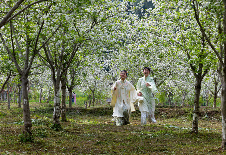 ▲大足区棠(tang)香街道惜字阁村,游客身着汉服在花间游玩。通讯员 瞿(ji)波 摄