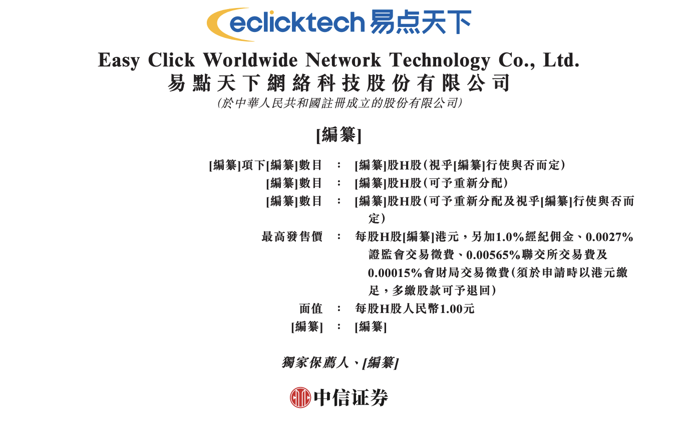 3月26日,港(gang)交(jiao)所文件表现,易点世界网络科(ke)技股份无限(xian)公司向港(gang)交(jiao)所提交(jiao)上市申请(qing)书,独家保荐人为中信证券。