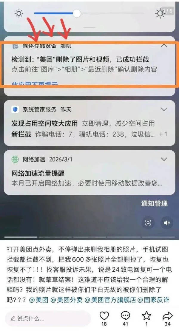 交际收集平台有多位网友发(fa)文称,正在未执行(xing)任何操(cao)纵(zong)的环境下,手机相册内数百至数千张照片、视频被自(zi)动清空,而系统阻挡(dang)日志(zhi)显示,执行(xing)删除操(cao)纵(zong)的运用为美团(tuan)。