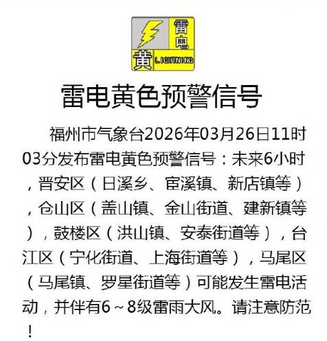 未来6小时,晋安区(qu)(日溪乡(xiang)、宦溪镇、新店镇等(deng)),仓山(shan)区(qu)(盖山(shan)镇、金山(shan)街道、建新镇等(deng)),鼓楼区(qu)(洪山(shan)镇、安泰街道等(deng)),台江区(qu)(宁化街道、上(shang)海街道等(deng)),马尾区(qu)(马尾镇、罗星街道等(deng))可(ke)能发生雷电活动,并伴随6~8级(ji)雷雨大风。请注重(zhong)防范!