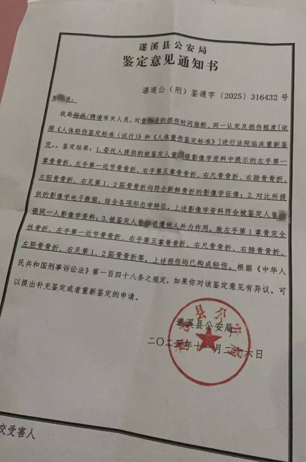 相关诊断结果表现,被殴(ou)打(da)后(hou),曾某银头部受伤,四肢多处骨折。1999年1月,针对曾某银的伤情,遂溪县(xian)公安局司法鉴定中心出具(ju)看法:骨折,暂定重伤。如(ru)医治历程中有肢体(ti)残疾再(zai)另定性。