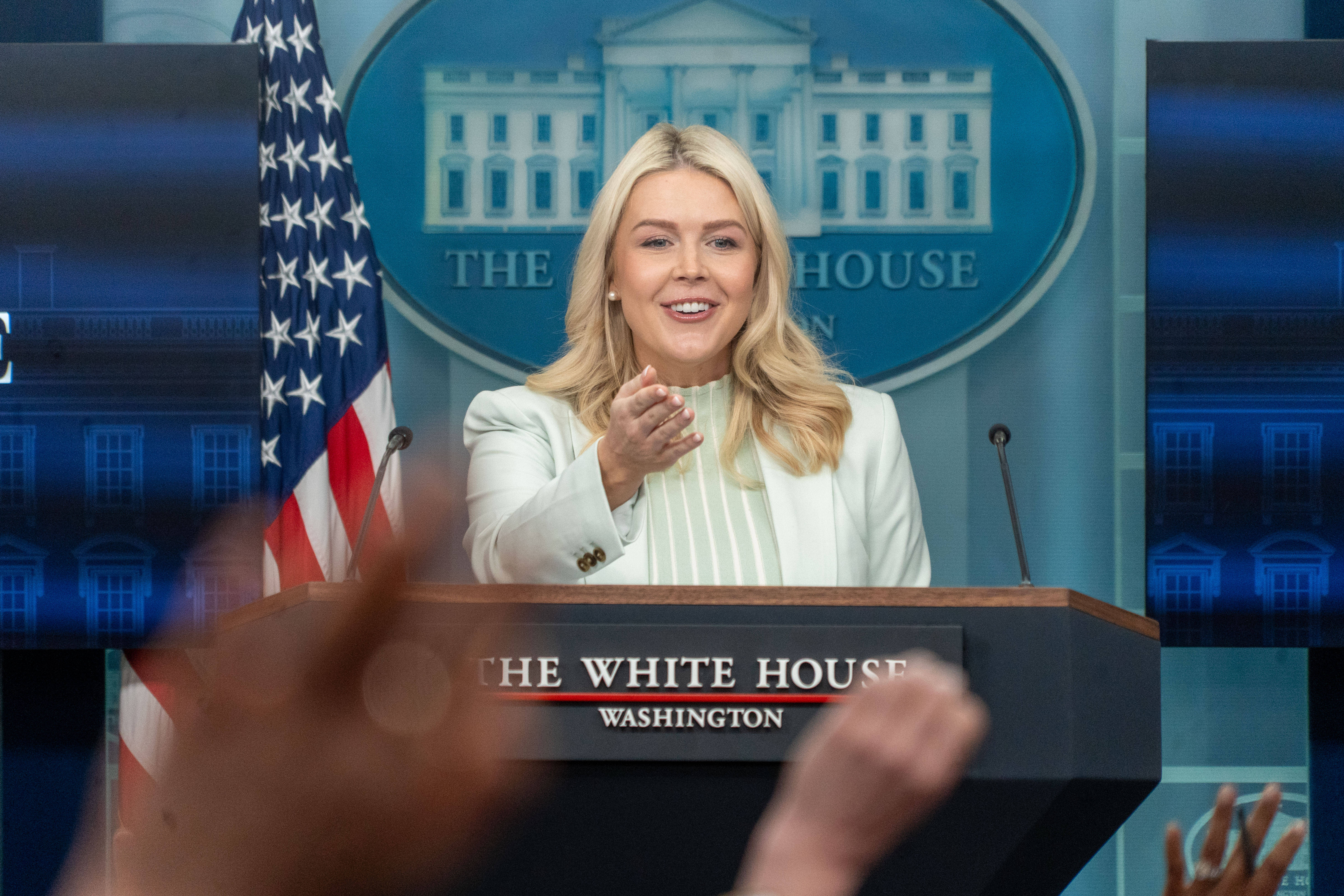 3月25日,在美国(guo)首都华盛顿白宫(gong),白宫(gong)新闻秘书莱维特出席记者会。 新华社发 (李源清摄(she))