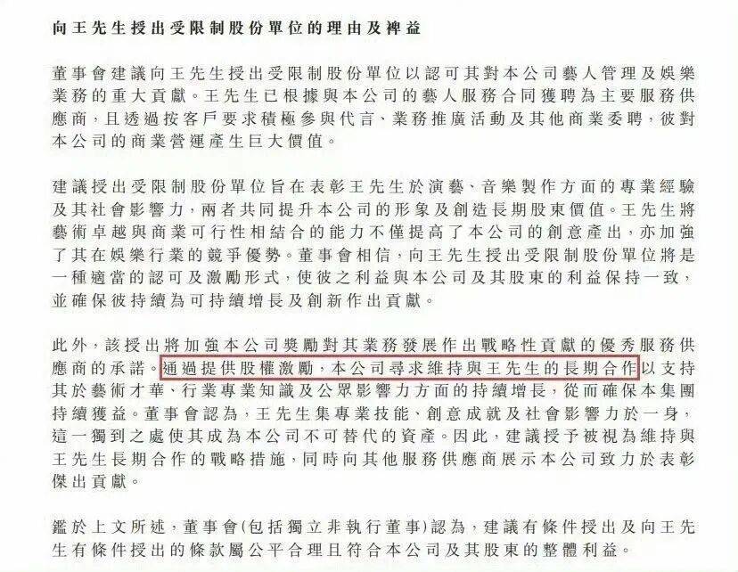据乐华(hua)娱乐2026年3月25日公开的董事会(hui)函(han)件,公司建(jian)议有前提(ti)向王一博(bo)授(shou)出股份(fen)奖励,旨(zhi)在认可及奖励其对团体业务作出的卓越(yue)贡献,寻求维持与王一博(bo)的长期合作。