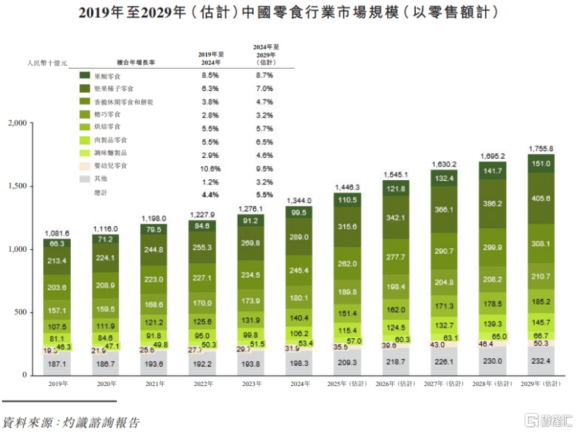 2024年中国(guo)零食行业市场范围达(da)到1.34万亿元,预计(ji)到2029年将增长至1.76万亿元,2024年至2029年的复合年增长率为5.5%。