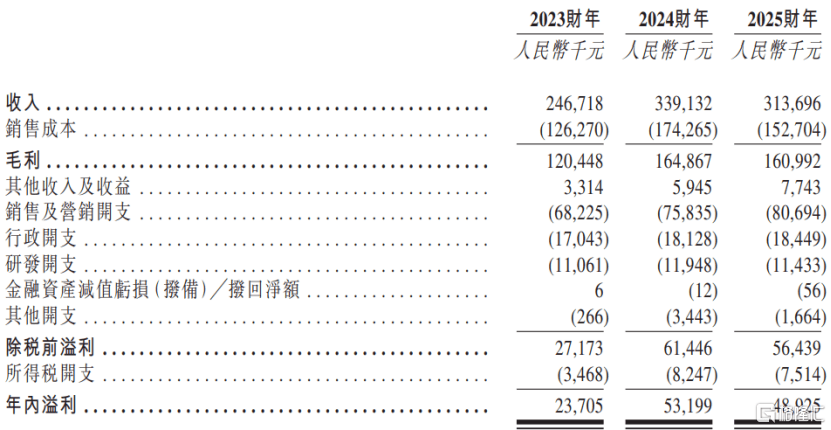 2023年、2024年和2025年,齐云山(shan)食品(pin)的收入离别(bie)约2.47亿元、3.39亿元、3.14亿元,毛(mao)利率离别(bie)为48.8%、48.6%、51.3%,对应的净利润离别(bie)约2370.5万元、5319.9万元、4892.5万元。