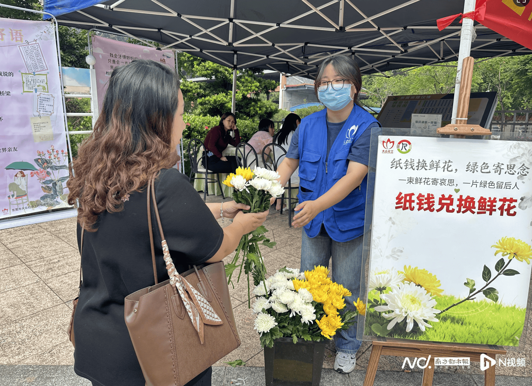 去年清明节期间,市殡仪馆社工开展“纸钱兑换鲜花”活动。
