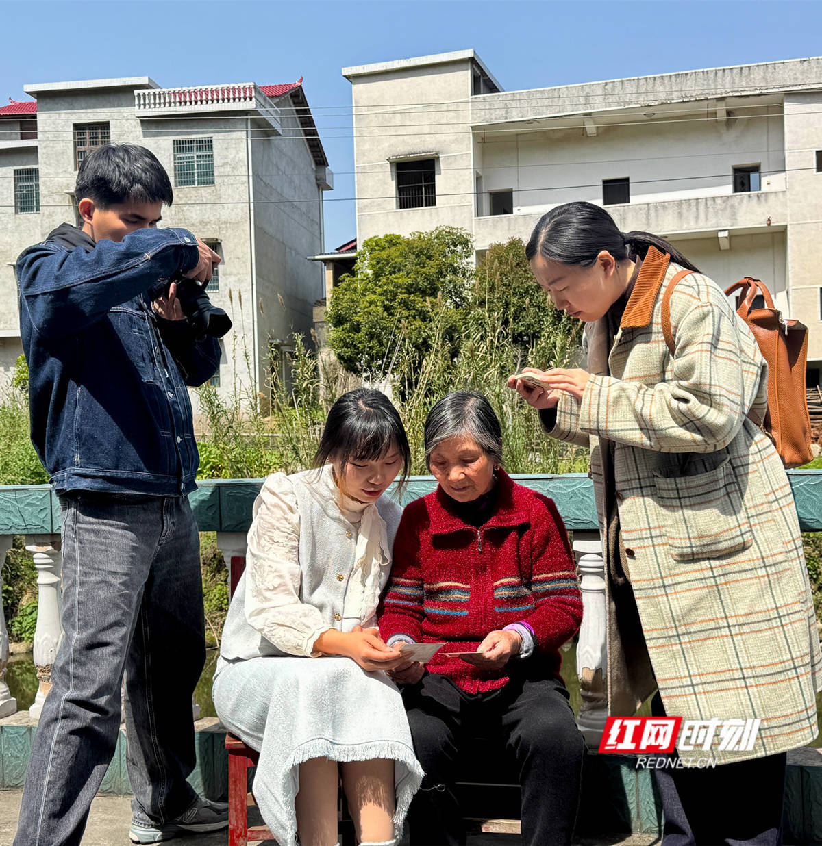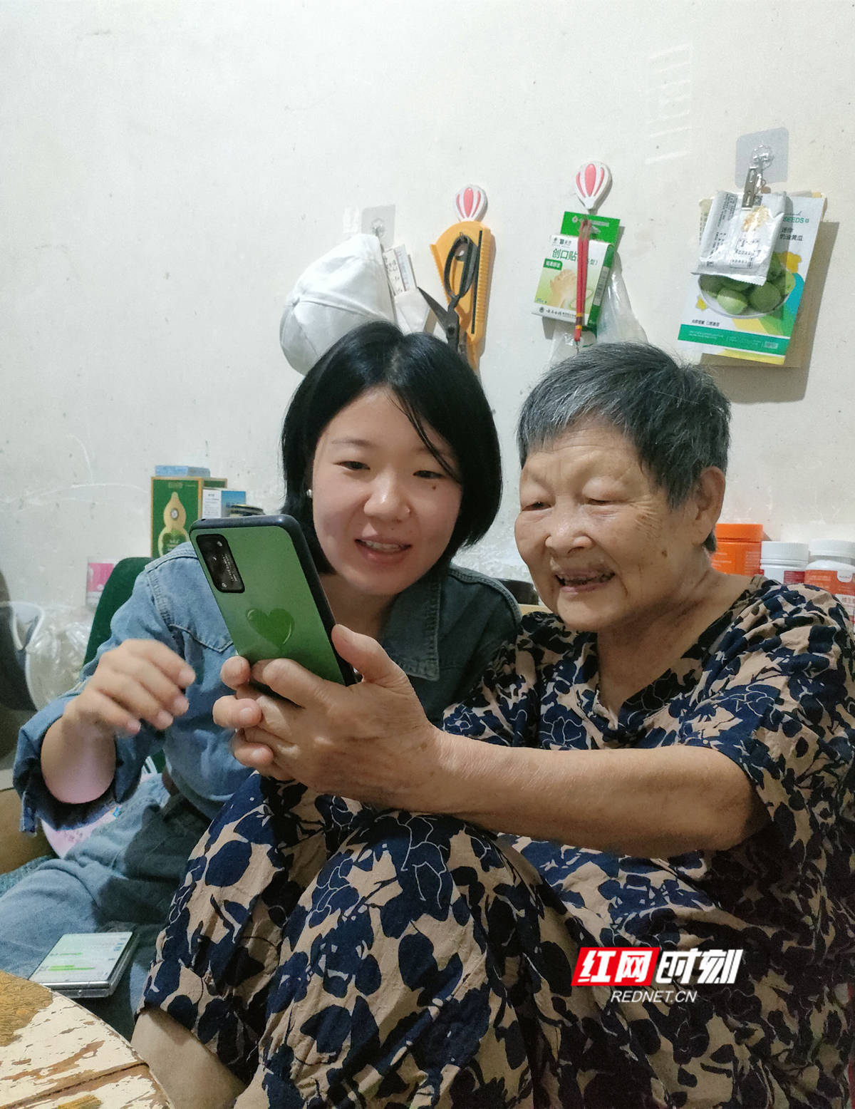 2024年,《群众路上原(yuan)居民》大型报导采访期间,红网记(ji)者何青与张家(jia)界市民陈启宇交流。白叟家(jia)兴高采烈地与何青分享她手机里的老(lao)照片。