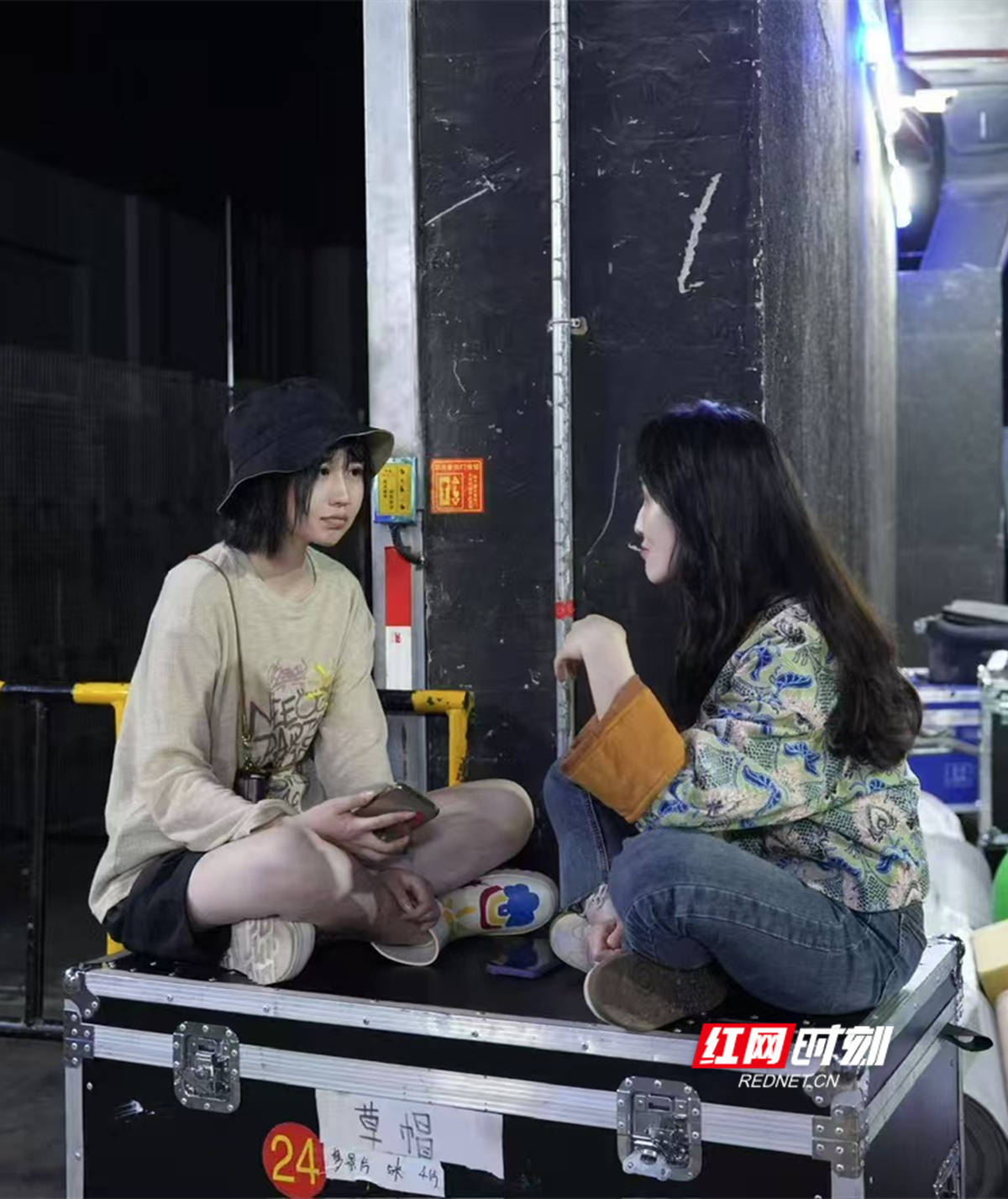 2025年5月28日,湖南大剧院后台一角,红网记(ji)者陈雅如(ru)(左)与湖南省杂武艺术剧院演出团副(fu)团长苏子慧(右)正(zheng)在道(dao)具箱上盘腿而坐,倾(qing)听她20年来的杂技人生。