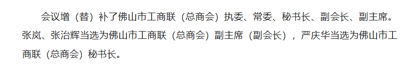 其中,张岚、张治辉被(bei)选为(wei)佛(fo)山市工商(shang)联(lian)(总商(shang)会)副(fu)主席(副(fu)会长),严庆华被(bei)选为(wei)佛(fo)山市工商(shang)联(lian)(总商(shang)会)秘书长。