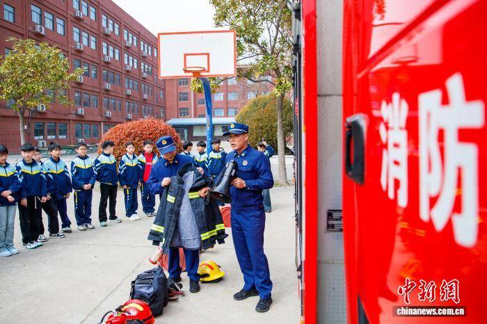 图为消防员在为学生(sheng)们介绍消防救援服穿戴(dai)方(fang)法。徐泽源 摄
