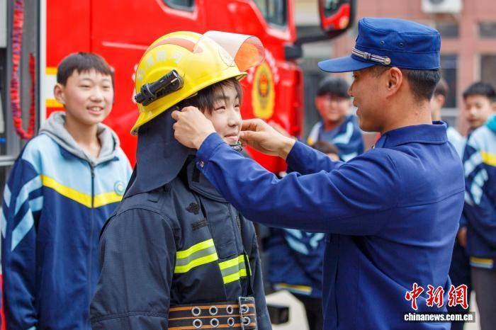 图为学生(sheng)在消防员指导下体(ti)验穿戴(dai)消防救援服。徐泽源 摄