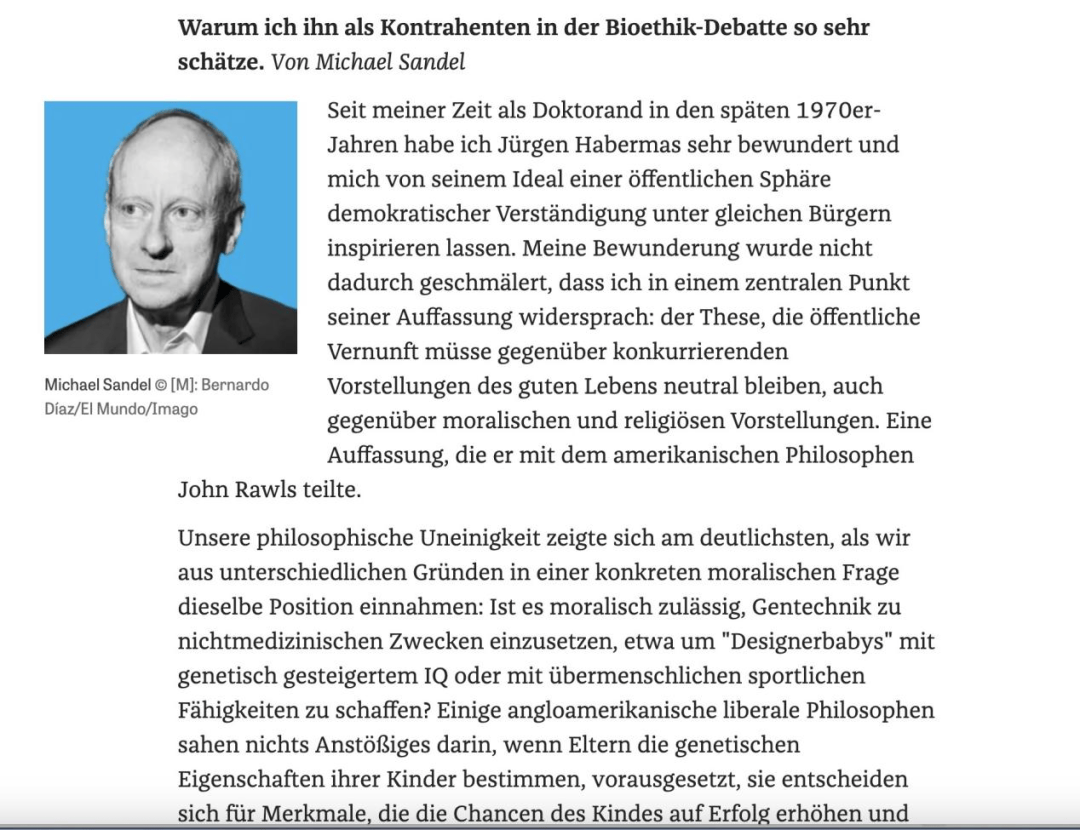 在纪念文章中,著有《精英的傲(ao)慢》《公道》等畅销书的哈佛大学政治哲学学者迈(mai)克尔·桑德尔回顾了他与哈贝马斯围绕基因改造的辩论。这(zhe)是桑德尔长期关注的议题,他曾在《阻挡完满》等作品中对(dui)此有过会合的探讨。在阻挡技术(shu)改造介入下的优生学这(zhe)一点(dian)上,哈贝马斯与桑德尔立场同等,但桑德尔始(shi)终没有赞许哈贝马斯阻挡优生学的理由。哈贝马斯认为,优生学的成绩首要是违反了“自(zi)立性”,由于基因改造使得小我私家无法(fa)将自(zi)己“视为本身(shen)人生故事的完整誊写者”。桑德尔则认为,“自(zi)在”并没有能构成一个充分的阻挡优生学的理由,一定程(cheng)度上,父母后天的教育也可能影响孩子(zi)的所(suo)谓“自(zi)在”。真正批(pi)判优生学的理由应当出于某些品德理由,比如父母对(dui)孩子(zi)无前提的爱。桑德尔认为,哈贝马斯给(gei)出的理由与他对(dui)公共范畴的畅想是同等的。哈贝马斯进展公共对(dui)话能对(dui)任何先在的善的看法(fa)保持中立。但是,桑德尔认为哈贝马斯与纯(chun)粹的自(zi)在主义学者有别:他依然在写作中流露(lu)出品德层面临优生学的反思(si)。“哲学家思(si)想中的这(zhe)种(zhong)冲(chong)突(tu),其实不是缺点(dian),而是一种(zhong)优势(shi)”,桑德尔写道。